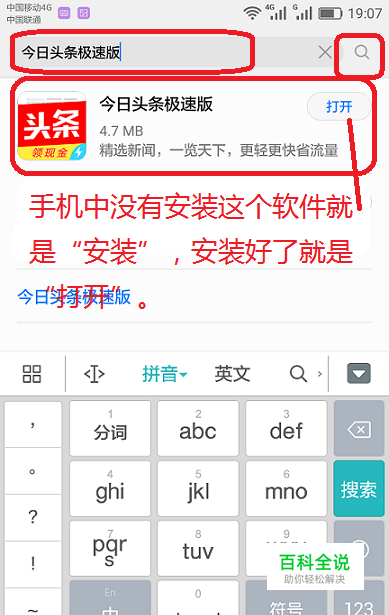 在搜索栏中输入“今日头条极速版”,然后点击右侧的搜索符号,在下方就会出现符合条件的软件,然后点击“安装”,按照手机中的提示,逐步完成头条app的安装。我的手机中已经下载并安装了这个软件,就会显示打开。