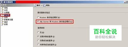 左侧选择“安全性”,选中右侧的“SQL Server 和 Windows 身份验证模式”以启用混合登录模式。