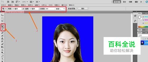 打开图片之后,找到左边菜单栏的裁剪工具,点击,在菜单栏上方设置宽度2.5厘米,高度3.5厘米。像素300。