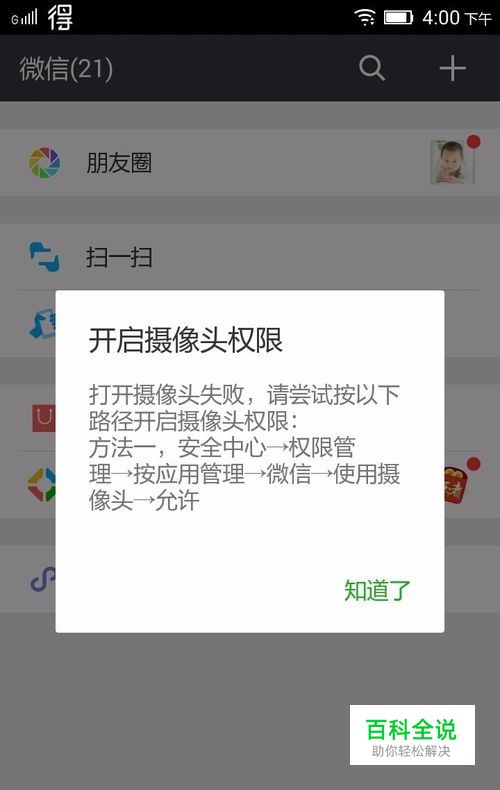 前段时间遇到用微信不能使用扫一扫功能的情况,一扫又显示没有摄像头权限,相应用微信拍摄照片直接发的权限也是没有的,下面给大家提供一下我的解决办法,希望对以后遇到这种情况的朋友有所帮助。
