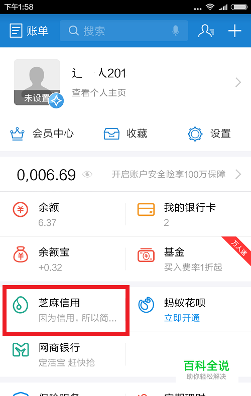 在左边依次有“余额”、“余额宝”、“芝麻信用”、“网商银行”等等,点击“芝麻信用”,我们要的东西就会慢慢出现。