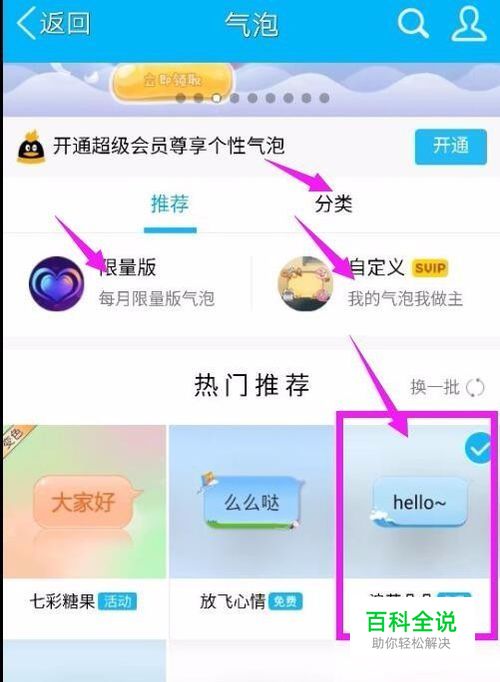 还可以直接选择“分类”“限量版”“自定义”来选择,但是有点需要收费,只有免费的可以直接使用,比如我们现在选择了一个免费的气泡,如图所示。