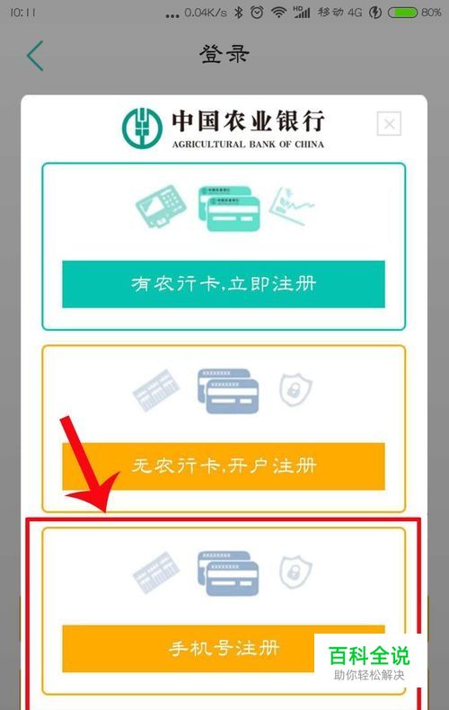 弹出注册方式,共有三种注册方式供选择,分别是”有农行卡,立即注册“、”无农行卡,开户注册“、”手机号注册“,在这里我们点击”手机号注册“