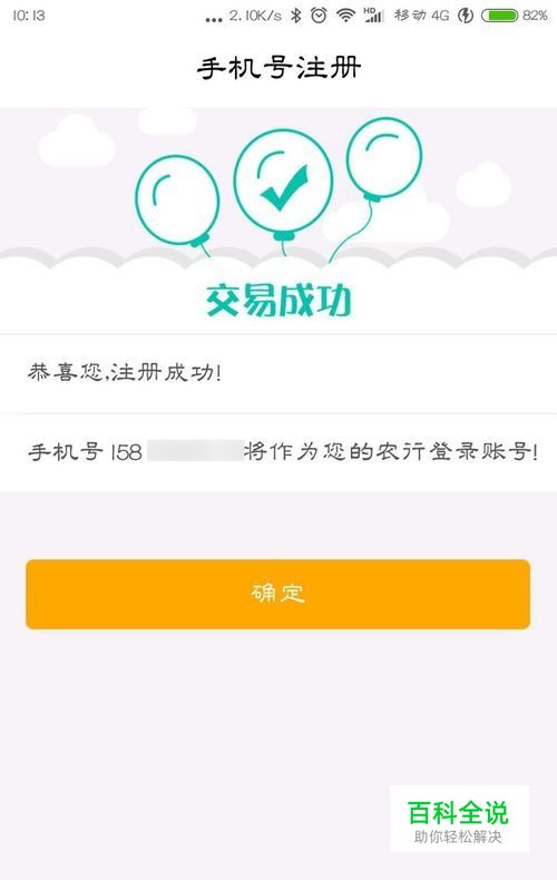 然后弹出手机号注册成功的界面。按”确定“后,回到”登录“界面,就可以使用手机号登录了。登录后再进行添加银行卡账号。