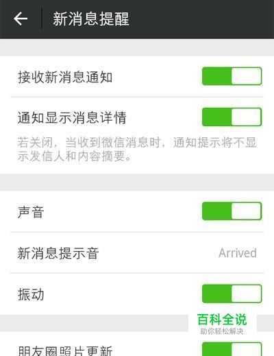在新消息提醒页面,可以看到的内容选项有:接收新消息通知、通知显示消息详情、声音、振动、朋友圈照片更新,可以根据自己的需要进行设置。如下图所示。