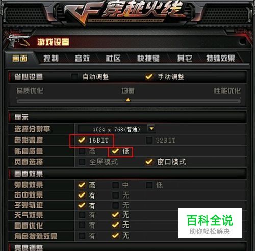 我们进入游戏,游戏设置,‘’色彩深度选择 16BIT‘’‘’贴图质量选择低‘’ ‘’画面效果 中或者无‘’亮度我们选择50即可