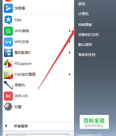 点击左下角的开始菜单命令,然后在右侧找到 控制面板如图所示。