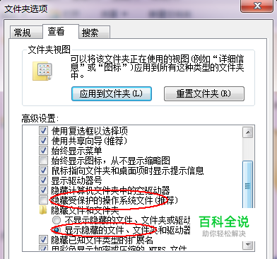 在文件夹选项里,选择查看标签卡找到显示系统文件和显示隐藏文件的选项显示所有文件。