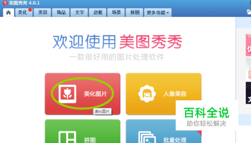 首先打开美图秀秀,在首页四个功能中选择第一个美化图片。