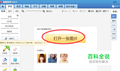 进入到美化图片功能页面,把要编辑的图片在美图秀秀上打开。点击打开图片,在蹦出来的对话框中,选择自己要编辑的图片打开。