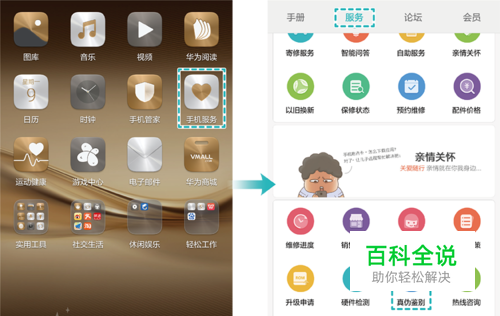 手机服务:在手机主屏幕,点击【手机服务】,在【服务】页签下,点击【真伪鉴别】。