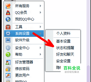 在弹出菜单中点击系统设置选项,然后会弹出一系列的次级菜单,点击状态和提醒选项。