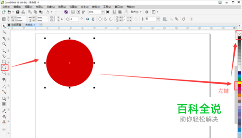 打开CDR软件,在左侧选择椭圆工具,画出一个正圆,然后选中圆形,鼠标左键点击右侧颜色栏的红色,鼠标右键点击颜色栏顶部的叉号。这样就给圆形填充了红色,并去掉了边框。