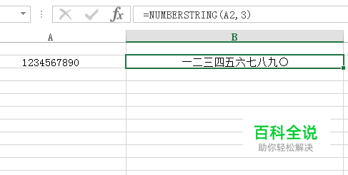 如下图,实际相当于函数=NUMBERSTRING(1234567890,1),参数为2时,输出结果直接为整个数字的大写。