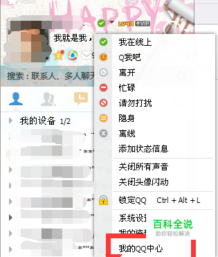 单击“状态菜单”(昵称旁边的倒三角形),再点击“我的QQ中心”