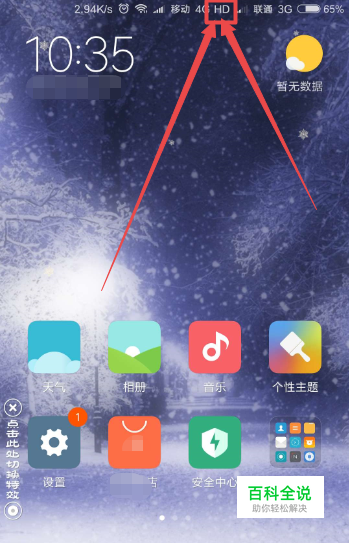 然后在手机屏幕的顶部,可以看到 HD 的字样。