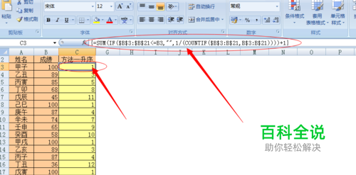 运用这一公式,首先是从高成绩到低成绩的升序排列。只需要在c2格中输入=SUMPRODUCT((B$2:B$20>B2)/COUNTIF($B$2:$B$20,$B$2:$B$20))+1 就可以了。