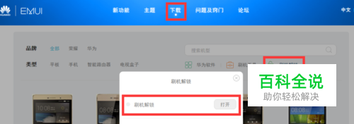 在EMUI首页点击“下载”在下载页面找到“刷机解锁”点击“刷机解锁”选择“刷机解锁选项”如图