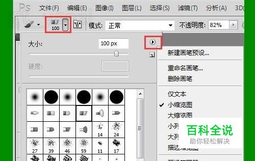 在“画笔”工具的属性栏中,打开“画笔预设”选取器,点击右上角的带圆圈的小黑三角按钮。