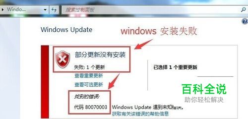 在电脑更新过程中,更新失败,程序无法安装,出现错误码80070003的提示。如图1