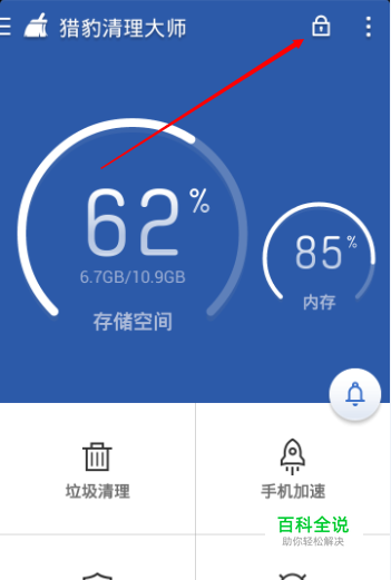 我们打开猎豹清理大师后,可以看到页面上方有有个小锁样的标志,我们点击它