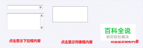 第二步,所有元件编辑如下所示,同时为下拉框、列表框和矩形分别命名为xia、lie、ju。
