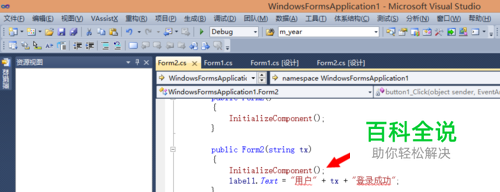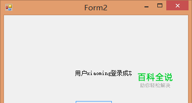 对窗体2添加构造函数,并对确定按钮添加响应函数: public Form2(string tx) { InitializeComponent(); label1.Text = "用户" + tx + "登录成功"; } private void button1_Click(object sender, EventArgs e) { Application.Exit(); }