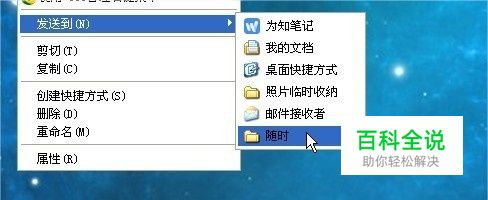 我要说的快速复制,是借助电脑的右键菜单,下面以XP系统为例。比如我的电脑,我随便选中要复制的文件,右键,在【发送】菜单里会看到这些目标文件夹。 比如我想复制一些文件到名称为“随时”的文件夹里。首先我们要找到【随时】文件夹,右键,选择“创建快捷方式”可以先将这个快捷方式放到桌面。方便查找。