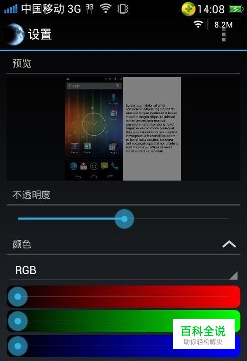 可以先调节调节颜色RGB,这可以改变滤镜的颜色,也可以在预览里看出变化。还可以自主调节设置里的屏幕亮度以及是否渲染状态栏等,这些设置也可以不调节,软件默认是采用纯黑幕和渲染状态栏,已经可以达到降低屏幕亮度的要求。