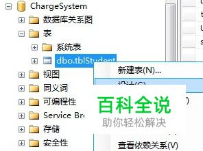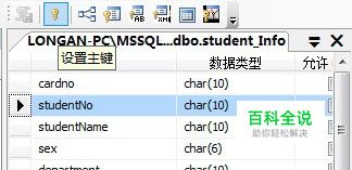 在表中常有一列或多列的组合,其值能唯一标识表中的每一行。 这样的一列或多列成为表的主键(PrimaryKey)。一个表只能有一个主键,而且主键约束中的列不能为空值。只有主键列才能被作为其他表的外键所创建。 创建主键约束可以右键单击表,选择设计。