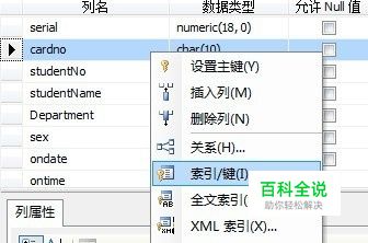 唯一约束确保表中的一列数据没有相同的值。与主键约束类似,唯一约束也强制唯一性,但唯一约束用于非主键的一列或者多列的组合,且一个表可以定义多个唯一约束。 右键单击要设置的列选择索引/键。