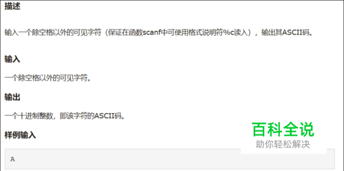 因为这是在讲知识点,那么解析和题解讲在下我的一篇经验里讲。 详情见:“如何用c++输入字符并输出其ASCII码?(c++版)“或”如何用c输入字符并输出其ASCII码?(c版)“。