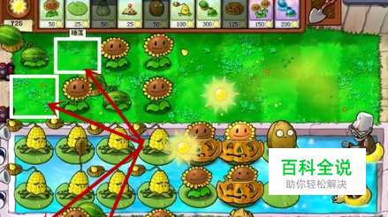 无尽模式的布局是非常关键的,一开始陆地必须要放4个西瓜,每行两个向日葵,水路后4排放玉米投手,紧接着放两排向日葵,南瓜罩罩住水面的向日葵,因为水底会冒出僵尸,太阳花前面可以放小坚果墙保护,这关以攒阳光为主。陆地上僵尸一共能走4个格子,所以事先在第四个格子埋好土豆,倭瓜留着危急时刻用。必须留出如图所示的空格,这些空格是后面用来补充植物的,这很关键。