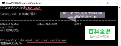 在命令行窗口输入查看用户帐户命令:net user 并回车。 命令返回的用户列表中包含有Guest,说明Guest账户还是存在的,只是没有启用。 继续输入启用Guest账户的命令:net user guest /active:yes并回车。 系统显示:发生系统错误 拒绝访问