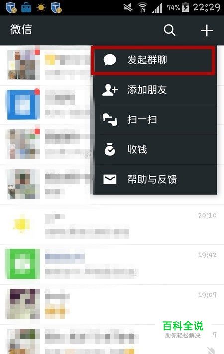 方法一:点击右上角菜单,选择“发起群聊”