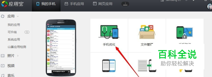2,下载后打开应用宝界面,如果手机已连接上,左侧会显示手机桌面。点击右侧的“手机优化”。