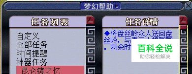 攻略1,战斗,必死,小怪无限高神,直接快速杀死主怪,虾兵就会召唤出龙王(龙王出来后建议召还BB) ~龙王出现阻止打斗,问阿盘为何闯禁地,阿盘神情恍惚自己也不知道怎么回事 ~询问龙王,疑有鬼魅作怪,不再追究阿盘,护送众PS弟子回盘丝岭 ~春三十娘感谢各位,留大家住几天,之后找盘丝岭众位聊聊,发现岭内阴云密布,甚至有弟子动刀动枪 攻略2,战斗,只一个怪,没什么攻击力,血很多(4弟子坐标依次为190,119 、 107,82 、 58,108 、 99,121) 奖励:(138级) 攻略3,战斗,不能杀两人形怪PS弟子,否则任务失败,杀死其它小怪即可 奖励: