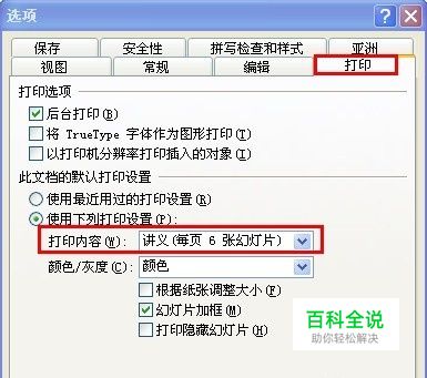 在打开的对话框中,切换到“保存”标签,将“使用下列打印设置的打印内容改为“讲义,每页*张幻灯片”。