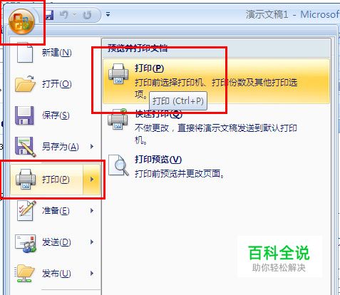 在Powerpoint2007中,点击左上角OFFICE按钮,点击打印,如图所示。