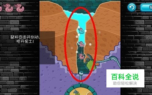 第2关,多了鸭子,我们不但要引水,还要把鸭子送到鳄鱼宝宝的浴缸里去,让宝宝开心。路线我以及截好图,看下面。