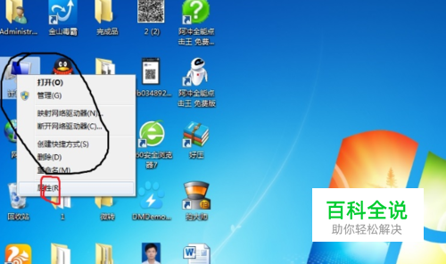 打开笔记本电脑的桌面,我们以win7系统为例,大家会看到win7的桌面,找到计算机这个图标,右键单击会出现如图所示的情况,黑色的区域是重点看的地方,大家会看到一个属性的选项,红色标出来了。左键单击一下就行。