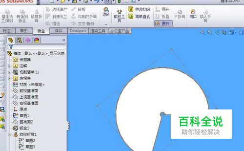 选择基准面2,在基准面2上绘制草图。绘制一个圆留有开口,因为一个闭合的草图无法生成钣金