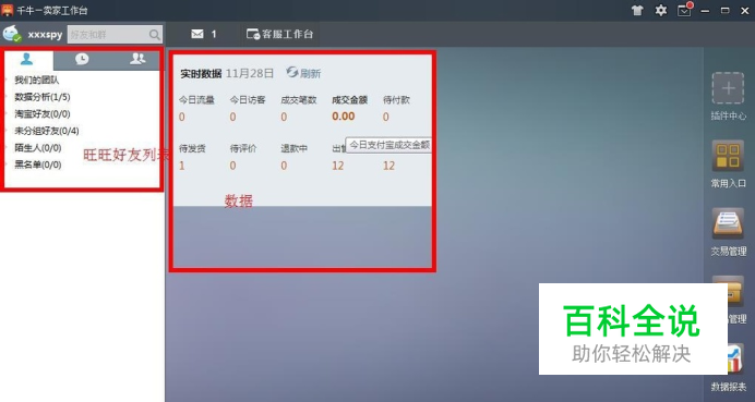 进入千牛-卖家工作台以后,我们首先看到的是自己的旺旺好友列表和实时数据。如果你之前登陆了旺旺,那么你的旺旺会被迫下线,不要以为自己的旺旺被盗号了,这就是工作台和旺旺是一样的。实时数据显示的是今日的流量、方可、成交金额等,是我们对店铺一目了然。