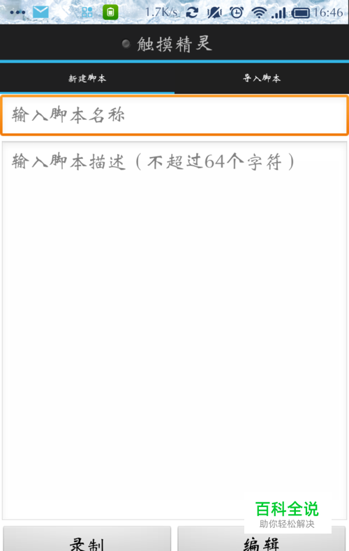打开触摸精灵,点击制作,输入一个容易记得名字,描述随便填写,然后点击录制