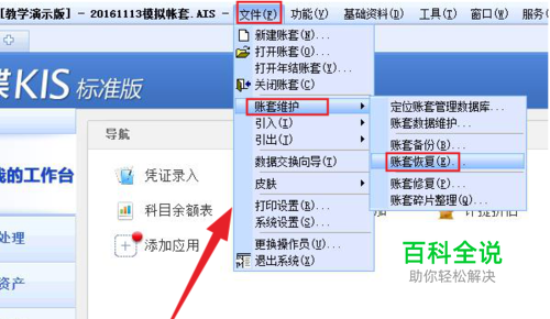 找到帐套恢复功能。 看“文件”,再看“帐套维护”,鼠标放在其上,右边就显示“帐套恢复”,点击......