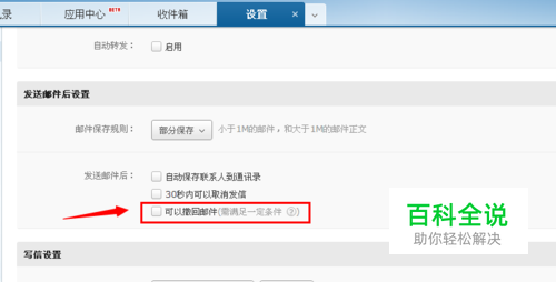 在“发送邮件后设置”里选择“可以撤回邮件”这一项,并且点击保存来保存设置