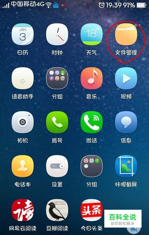 点击手机自带“文件管理”,也可是自己下载的文件管理.(如果用电脑传输,此步骤可省略)