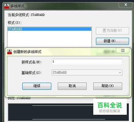 单击“新建”按钮,随后弹出“创建新的多线样式”对话框,在“新样式名”文本框中输入要建立的样式名称“1”,再单击“继续”按钮。