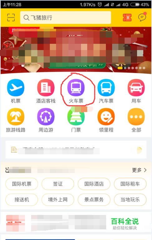 打开飞猪应用,如下图所示,点击红色标注的火车票的图标位置,进入火车票购买界面