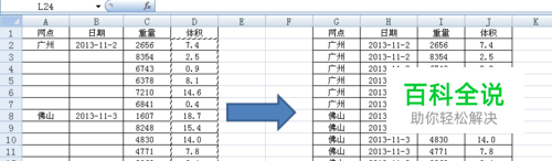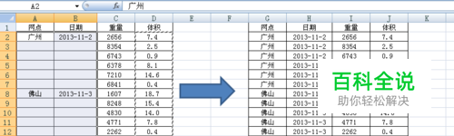 以下图为例说明,将左侧表格怎么经过快速填充变成右侧表格呢?